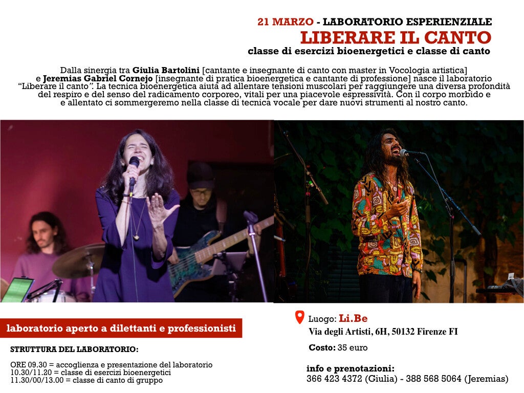 e Jeremias Gabriel Cornejo [insegnante di pratica bioenergetica e cantante di professione] nasce il laboratorio “Liberare il canto”. La tecnica bioenergetica aiuta ad allentare tensioni muscolari per raggiungere una diversa profondità del respiro e del senso del radicamento corporeo, vitali per una piacevole espressività. Con il corpo morbido e allentato ci sommergeremo nella classe di tecnica vocale per dare nuovi strumenti al nostro canto.